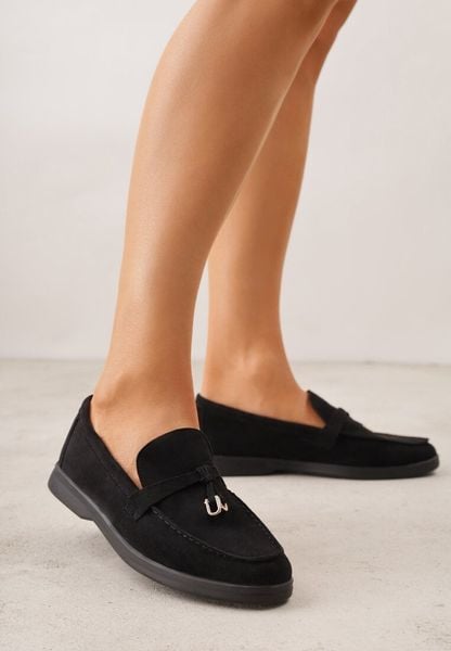 Czarne Mokasyny z Imitacji Zamszu z Ozdobnym Przeszyciem i Zawieszką Veleyra