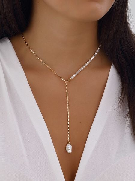 – materiał: metal- powłoka: złoto- zapięcie: karabińczyk – rodzaj pereł: perły syntetyczne- kolor perły: białyZdjęcie produktu w powiększeniu.