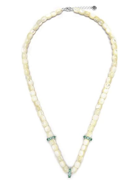 – materiał 1: masa perłowa- materiał 2: srebro Sterling próby 925- zapięcie: karabińczyk- rodzaj kamienia: cyrkonia- kolor kamienia: zielony- regulacja długości: takWskazówka: Zdjęcie produktu w powiększeniu.