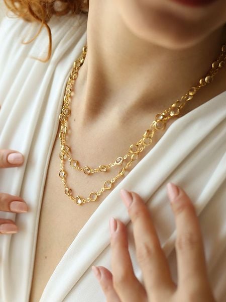 – materiał: mosiądz- powłoka: złoto- zapięcie: karabińczyk- rodzaj kamienia: kryształ- kolor kamienia: beżowy- regulacja długości: tak- opakowanie: pudełko prezentoweWskazówka: Zdjęcie produktu w powiększeniu.