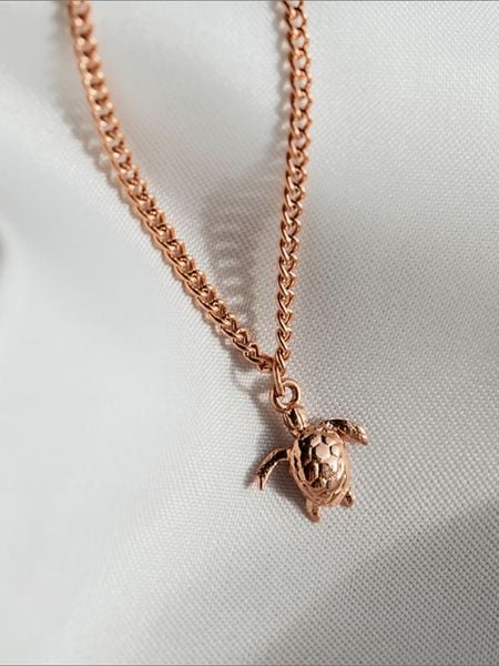 – materiał: stal szlachetna- powłoka: w kolorze różowego złota- zapięcie: karabińczyk- kształt zawieszki: żółw- regulacja długości: takWskazówka: Zdjęcie produktu w powiększeniu.