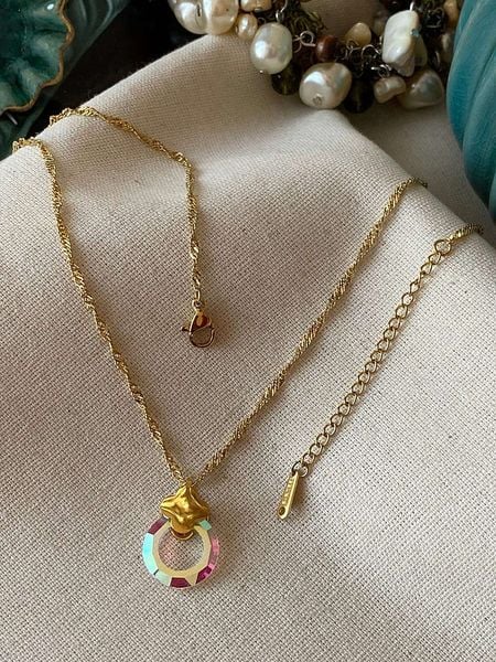 – materiał: mosiądz- powłoka: 14K złoto- typ łańcuszka: ankier- zapięcie: karabińczyk- rodzaj kamienia: kryształ- kolor kamienia: wielokolorowy- kształt zawieszki: koło- regulacja długości: takWskazówka: Zdjęcie produktu w powiększeniu.