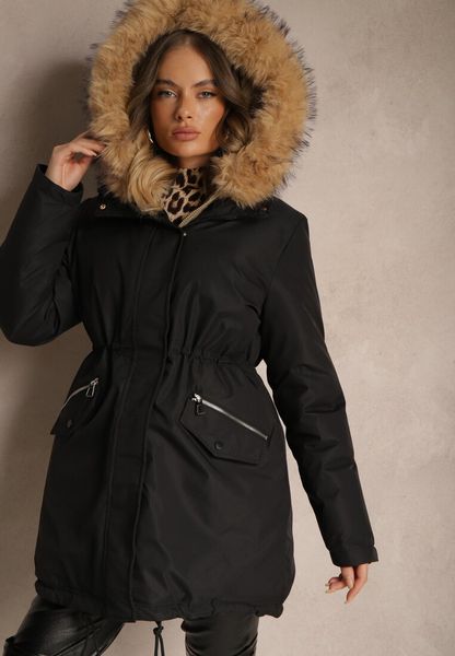 Czarna Kurtka Parka Ściągana w Talii z Podwójnym Suwakiem i Kapturem z Futrem Edrieth