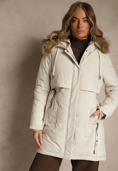 Biała Pikowana Kurtka Parka z Odpinanym Kapturem na Suwak Ściągana w Talii Ericeas