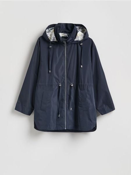 Kurtka o swobodnym kroju, wykonana z gładkiej tkaniny.