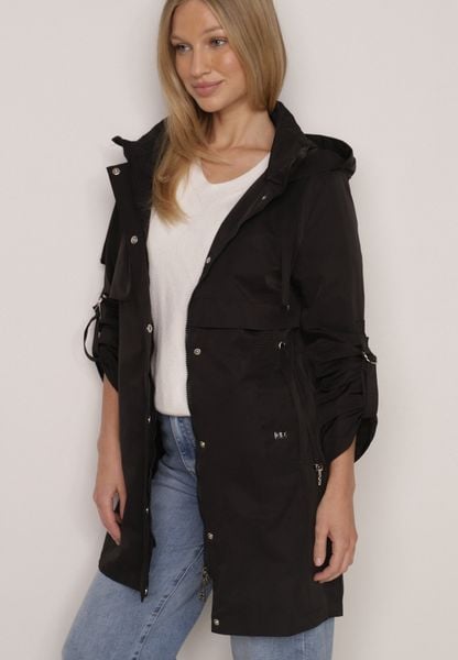 Czarna Kurtka w Stylu Parki z Odpinanym Kapturem i Sznurkami Enang