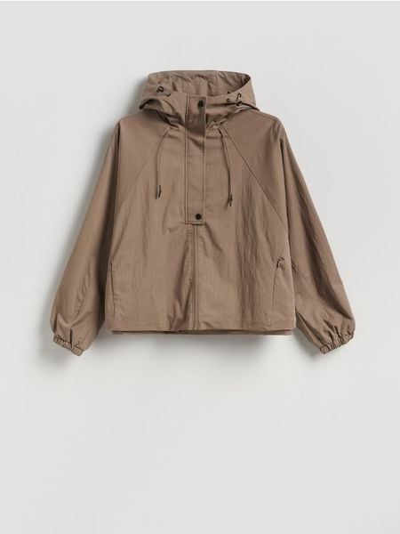 Kurtka o swobodnym kroju, wykonana z tkaniny o podstawowej wodoodporności.