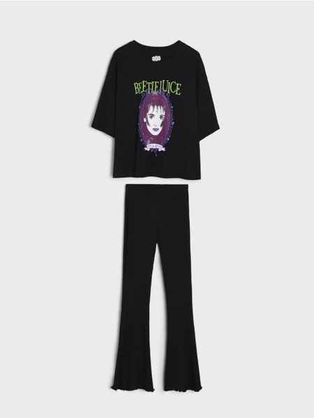 Sinsay – Piżama dwuczęściowa Beetlejuice – czarny – spodnie z gumką w pasie,szerokie, surowo wykończone nogawki,koszulka o luźnym kroju,ozdobny nadruk z przodu,100% bawełna