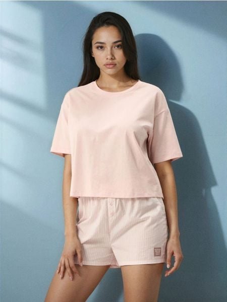Sinsay – Bawełniana piżama z krótkim rękawem i szortami w paski – różowy –