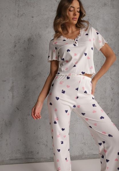Biały Elastyczny Komplet Piżamowy w Serduszka Spodnie i Top Isle