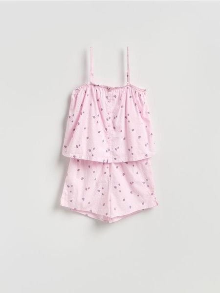 Piżama o prostym kroju, wykonana z bawełnianej tkaniny.