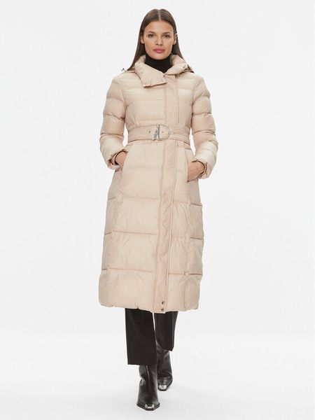 Beżowa Zimowa Kurtka za Kolano Płaszcz z Szerokim Pikowaniem i Nieodpinanym Kapturem Hressa
