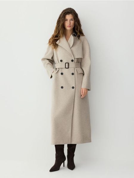 Dwurzędowy płaszcz z wełną – beżowy