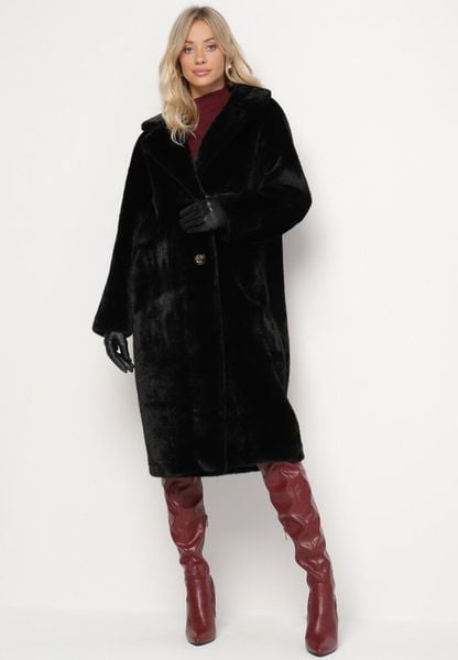 Czarny Futrzany Płaszcz Jednorzędowy z Kieszeniami Zapinany na Guziki Parilda