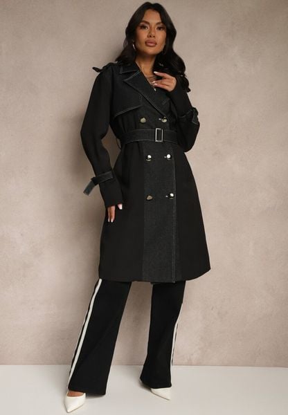 Czarny Płaszcz z Bawełną Typu Trencz z Jeansowymi Wstawkami Felsedi