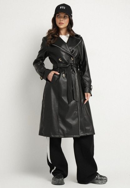 Czarny Dwurzędowy Płaszcz Trencz z Imitacji Skóry z Wiązanym Paskiem Nilovessa
