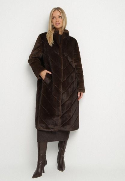 Brązowy Długi Płaszcz Futerko z Ozdobnymi Przeszyciami i Stójką Zenima