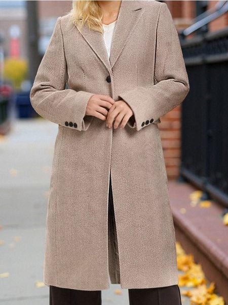 Klasyczny płaszcz jednorzędowy w jodełkę – kremowy