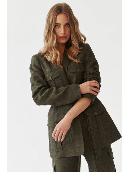 – kołnierzyk: z klapami- zapięcie: listwa guzikowa- kieszenie: naszyte- zdejmowany pasek: tkanina- krój: prosty- dolny brzeg: z rozcięciem- wzór: melanżowy