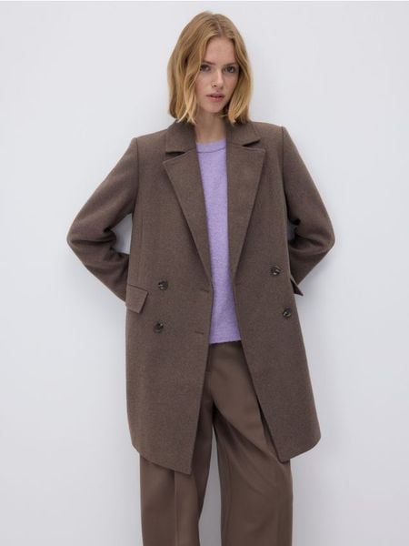 Płaszcz o klasycznym fasonie, wykonany z tkaniny z dodatkiem wełny.