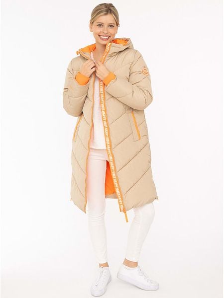 Beżowa Długa Kurtka Pikowana Płaszcz Mocno Ocieplona z Nieodpinanym Kapturem Naliope