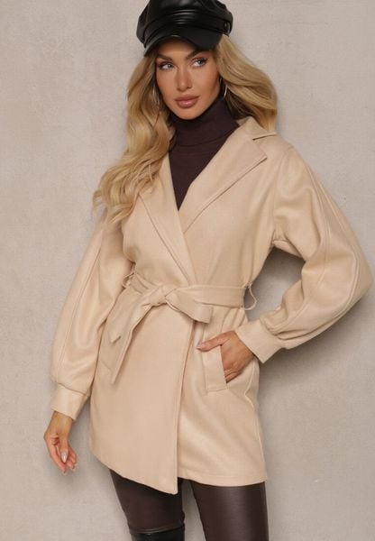 Beżowy Płaszcz z Wiązanym Paskiem i Bufiastym Rękawem Agnage