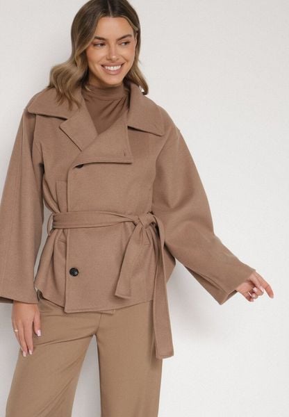 Beżowy Pudełkowy Krótki Płaszcz z Wiskozą z Wiązanym Paskiem i Kołnierzykiem Tusainea