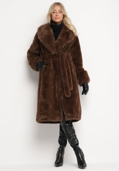Brązowy Futrzany Płaszcz z Wiązanym Paskiem Ozdobnym Kołnierzem i Mankietami Viaressa