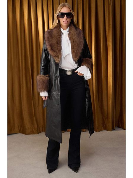 – kołnierz: drapowany – wstawka ze sztucznego futerka: tak – zapięcie: listwa guzikowa – odpinany pasek: tkanina- kieszenie: wpuszczane- krój: prosty- look: imitacja skóry, jednokolorowy