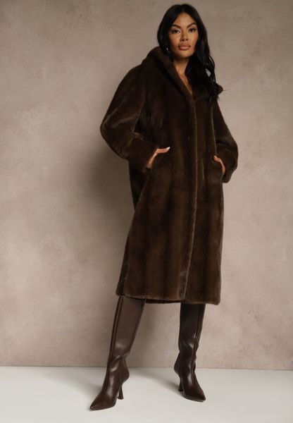 Brązowy Futrzany Płaszcz z Kapturem Zdobiony Pionowym Wzorem Elrinrahne