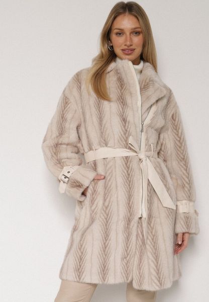 Jasnobeżowy Futrzany Płaszcz z Wiązanym Paskiem i Ozdobnymi Sprzączkami Felryna