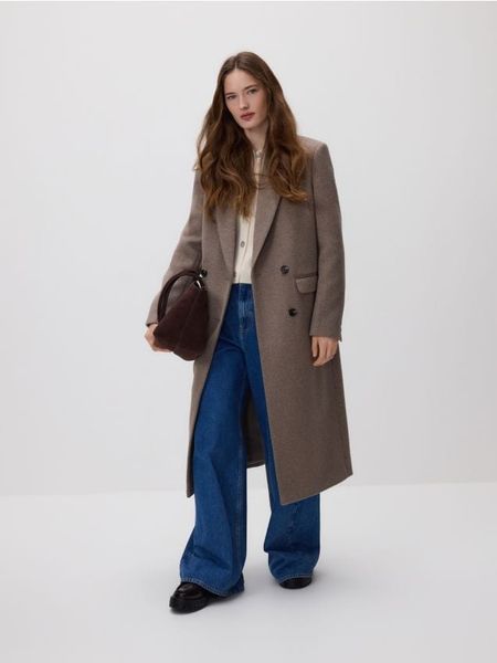 Płaszcz o prostym kroju, wykonany z tkaniny z dodatkiem wełny.