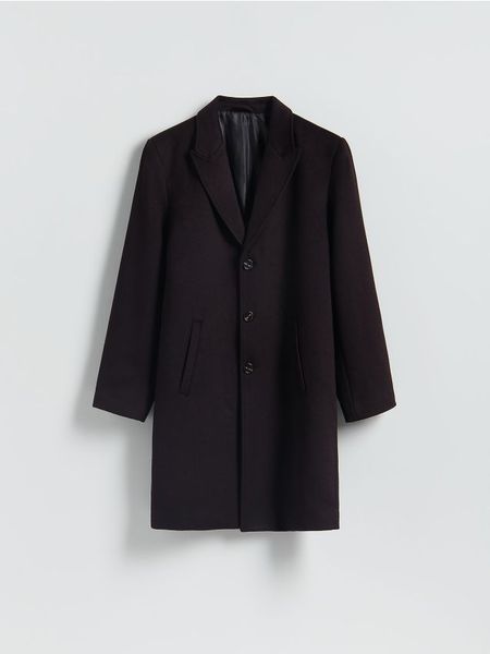 Płaszcz o prostym kroju, wykonany z tkaniny z wełną.