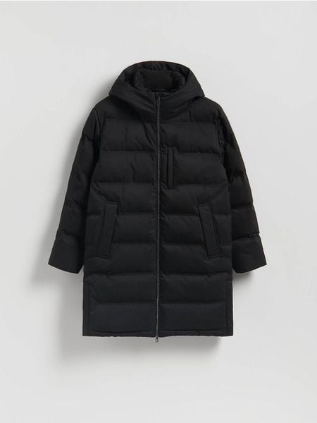 Długa pikowana kurtka z kapturem – czarny