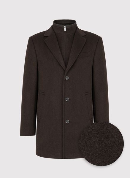 Brązowy płaszcz męski – Pako Lorente. Ciemny płaszcz na sezon jesieno-zimowy. Skład: 60% wełna, 40% poliester. Podszewka: 100% poliester. Wełniany płaszcz z odpinaną stójką.