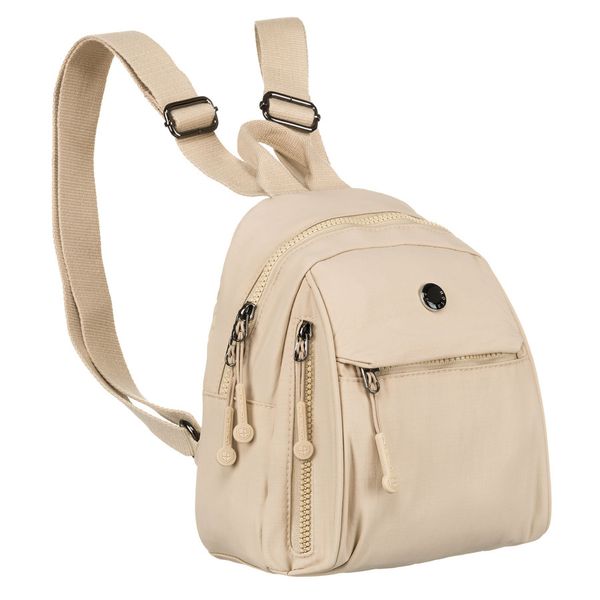 Damski plecak wykonany z poliestru w kolorze beżowym. Zamykany suwakami. Okucia w srebrnym kolorze. Dzięki kompaktowym wymiarom jest idealnym wyborem na miasto, spacer czy w podróży. Plecak zawieszony na regulowanych szelkach.