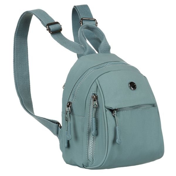 Mały, miejski plecak damski wykonany z poliestru. Plecak w błękitnym kolorze zamykany suwakami. Okucia w srebrnym kolorze. Zawieszony na regulowanych szelkach, wyposażony w sześć dodatkowych kieszeni.