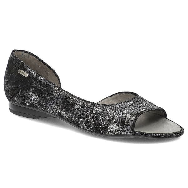 Półbuty damskie Maciejka, zamsz z otwartymi palcami miękką wkładką i na płaskiej podeszwie, czarne srebrny nalot, 0554-35-00-5