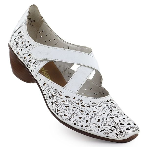 Skórzane półbuty damskie ażurowe na obcasie białe Rieker 43773-80