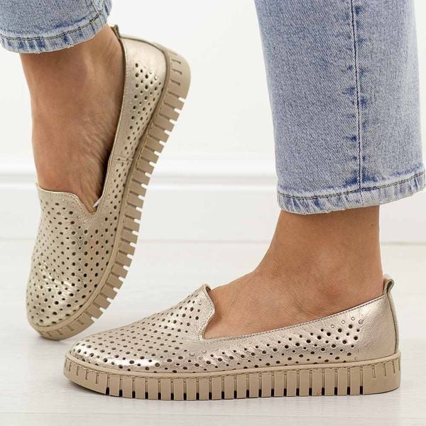Złote ażurowe skórzane Polskie półbuty damskie Deoni D056