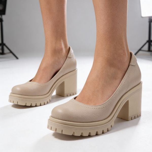Półbuty damskie Armodo, cholewka ze skóry naturalnej o gładkim wykończeniu, klasyczna linia z zaokrąglonym noskiem, stabilny obcas osadzony na grubej platformie z wyraźnym bieżnikiem zapewniającym komfort, beżowe, 20194