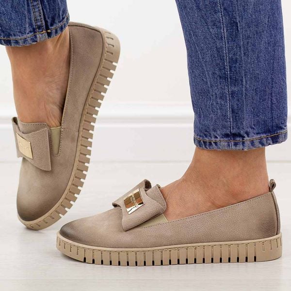 Eleganckie i niezwykle stylowe cappucciono skórzane półbuty damskie Deonito doskonała propozycja na wiosnę, lato i jesień, a także na wyjątkowe okazje. Cholewka wykonana z wysokiej jakości skóry naturalnej zachwyca trwałością oraz eleganckim wykończeniem. Z przodu znajduje się efektowna, duża złota ozdoba, która nadaje obuwiu modnego i kobiecego charakteru. Model wyposażono w dwie elastyczne gumki, które ułatwiają […]