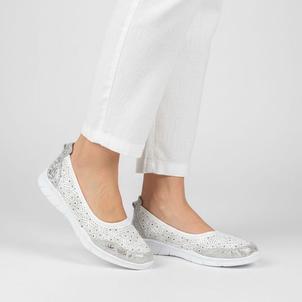 Półbuty damskie S.Barski, cholewka skóra naturalna perforowana z metalicznym wykończeniem fason wsuwany niski krój zaokrąglony nosek, elastyczna konstrukcja, białe, GR61-5973