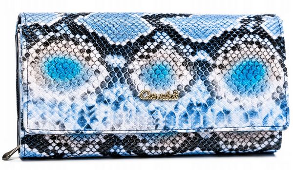 Środek portfela jest wykończony najwyższej jakości skórą naturalną, natomiast zewnętrzna część to błyszcząca skóra eko. Portfel charakteryzuje się pięknym motywem skóry węża. Portfel wyposażony jest w technologię RFID BLOCKING SYSTEM.
