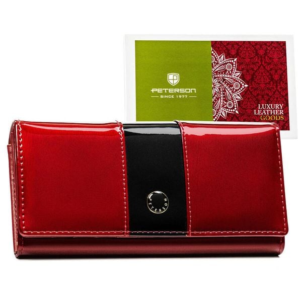 Elegancki portfel damski Peterson z wysokojakościowej skóry naturalnej o lakierowanym wykończeniu. Niezwykle bezpieczny dzięki technologii ochrony RFID! Wyposażony w praktyczne zakładki na karty i dokumenty oraz sekcje na gotówkę.