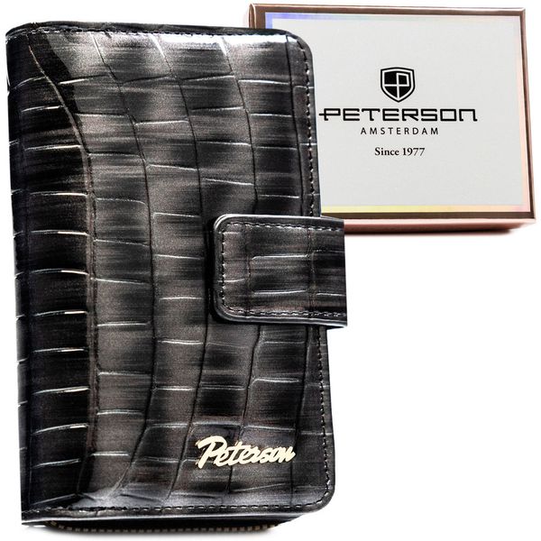 Szary portfel damski ze skóry ekologicznej z tłoczeniem na wzór skóry krokodyla, zamykany na zatrzask i suwak – Peterson