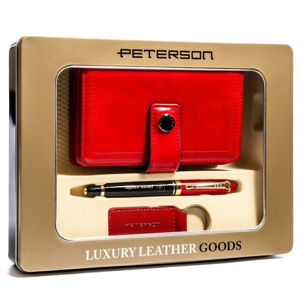 Elegancki zestaw prezentowy Peterson w modnym kolorze zawiera portfel ze skóry ekologicznej z technologią RFID, stylowy brelok oraz praktyczny długopis. Idealny wybór na każdą okazję dla kobiet ceniących klasę i funkcjonalność.