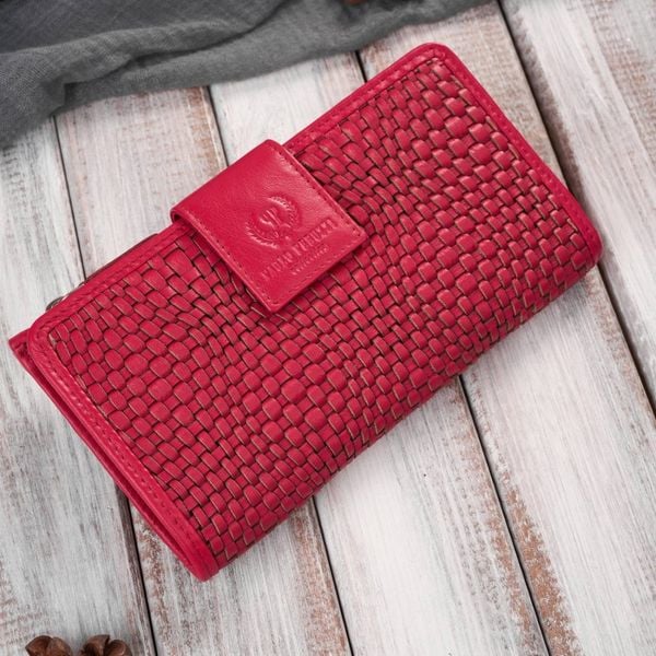 Portfel damski skórzany w kolorze malinowym duży pleciony Paolo Peruzzi AY-08-RD