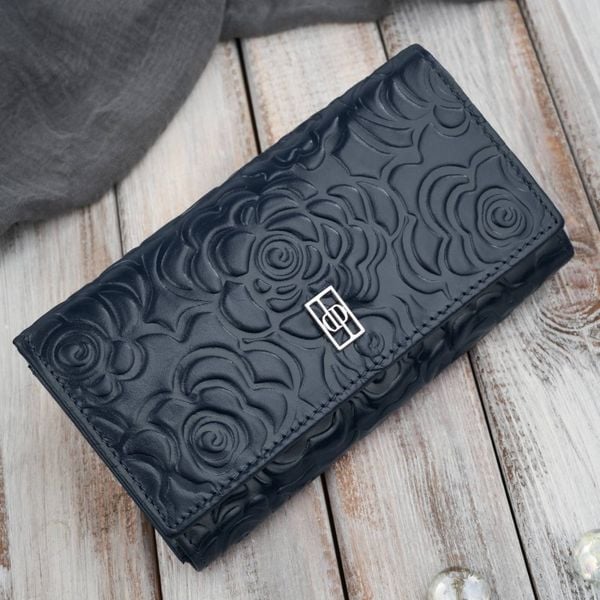 Duży portfel damski skórzany z tłoczeniem w kwiaty granatowy Paolo Peruzzi AL-14-NV