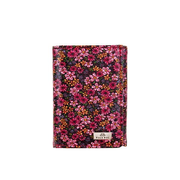 Mały portfel BajuBaj z kolorowej skóry licowej w kwiaty. 6 miejsc na karty, przegroda na banknoty, kieszeń na monety i zdjęcie.